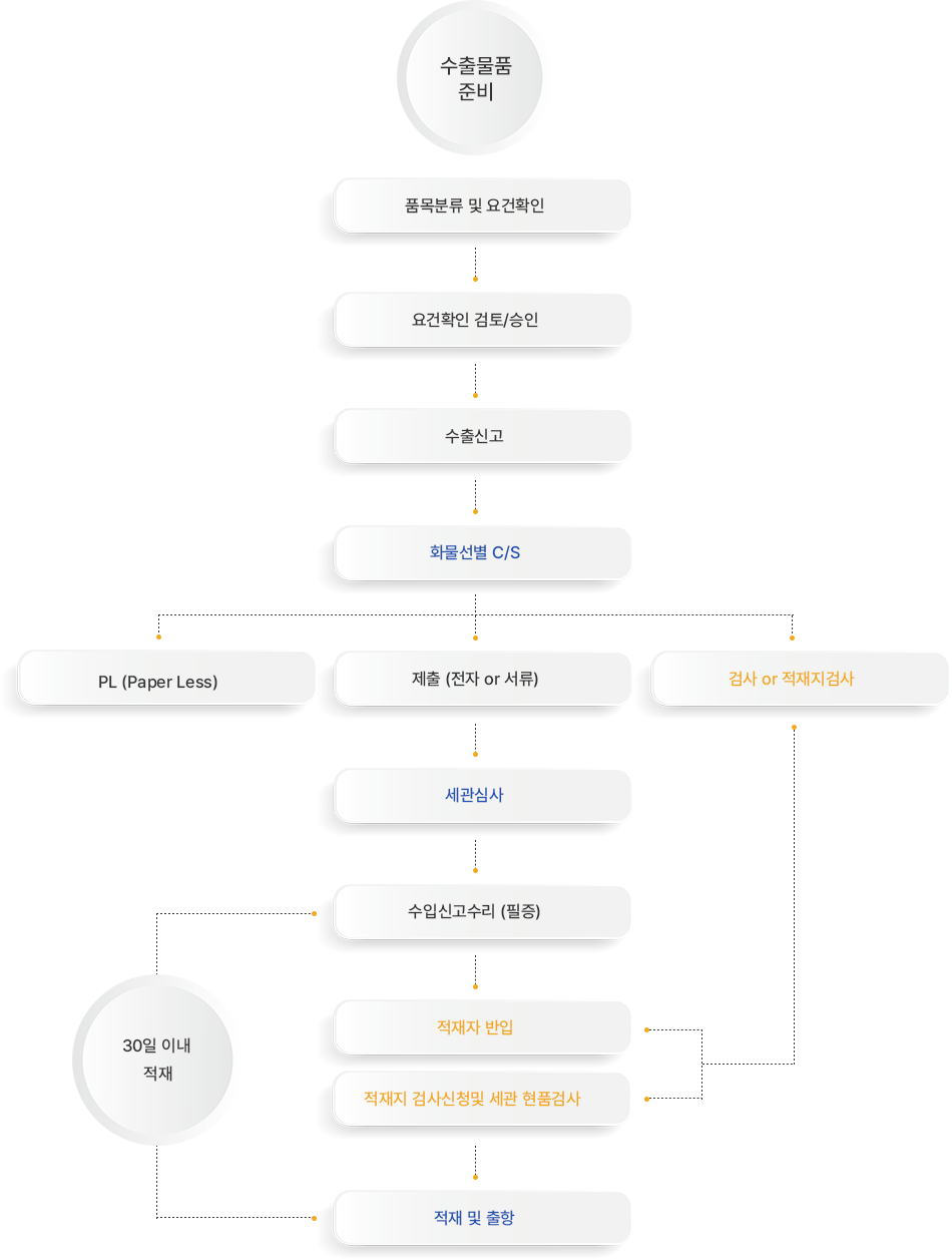 관세법상 수출이란 국경(관세선)내의 물품(내국물품)을 외국으로 반출하는 것을 말합니다. 수출을 하기 위해서는 물품의 품명·규격·수량 및 가격 등의 사항을 세관장에게 신고하고 정해진 기간 내 운송수단에 적재하여야 하는 바, 이를 수출통관 절차라 합니다. 수출신고는 화주 또는 관세사등의 명의로 하여야 하며, 신속하고 정확한 수출통관 절차를 이행하기 위하여 대부분의 수출업체는 관세사를 통해 수출신고를 진행하고 있습니다.